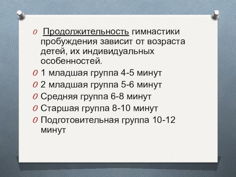 Слайд 4 Продолжительность гимнастики пробуждения зависит от возраста детей, их индивидуальных особенностей.