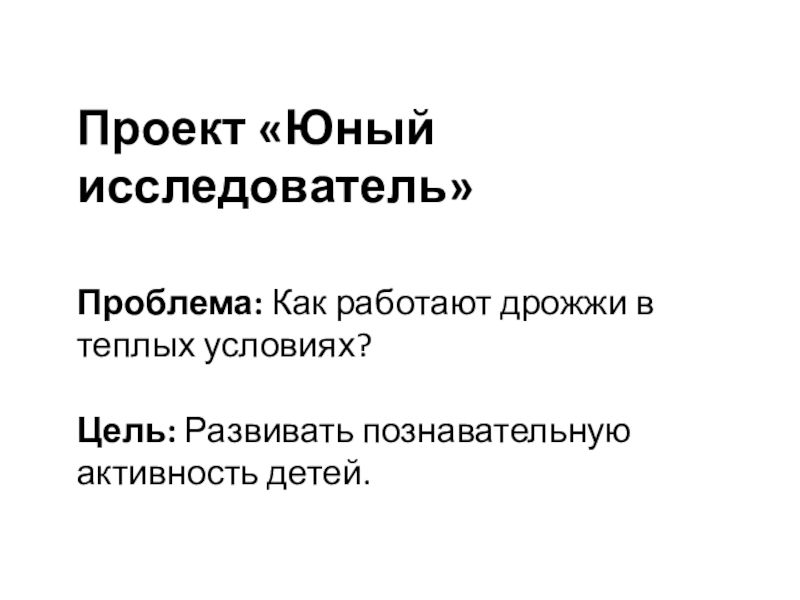 Проект «Юный исследователь»Проблема: Как работают дрожжи в теплых условиях?Цель: Развивать познавательную активность детей.