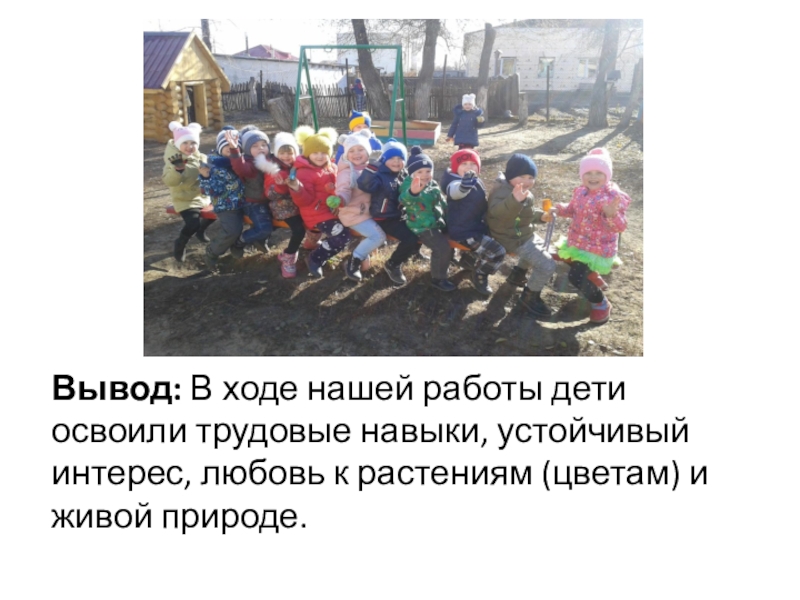 Слайд 14Вывод: В ходе нашей работы дети освоили трудовые навыки, устойчивый интерес,