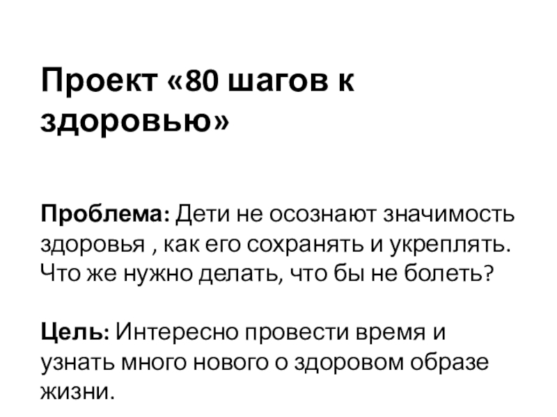 Проект «80 шагов к здоровью»Проблема: Дети не осознают значимость здоровья , как его сохранять и укреплять. Что