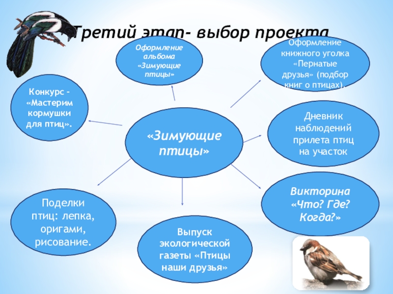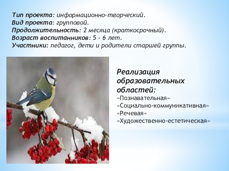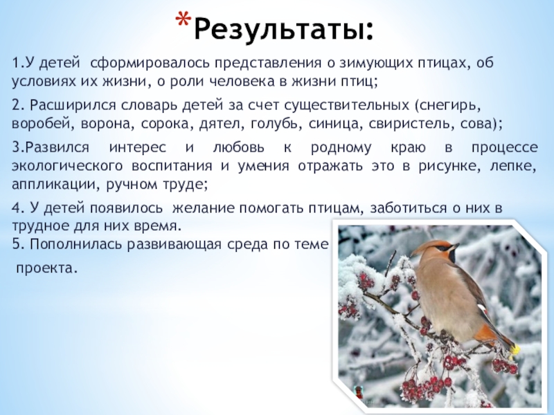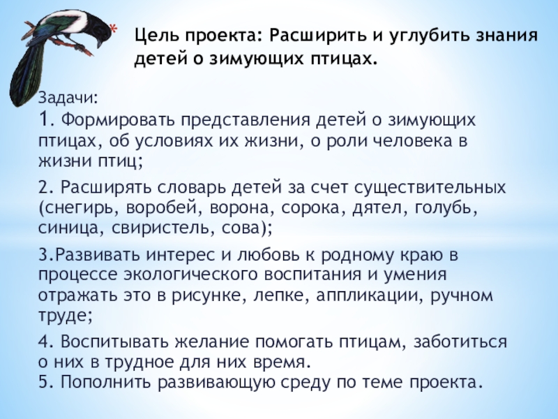 Цель проекта: Расширить и углубить знания детей о зимующих птицах.