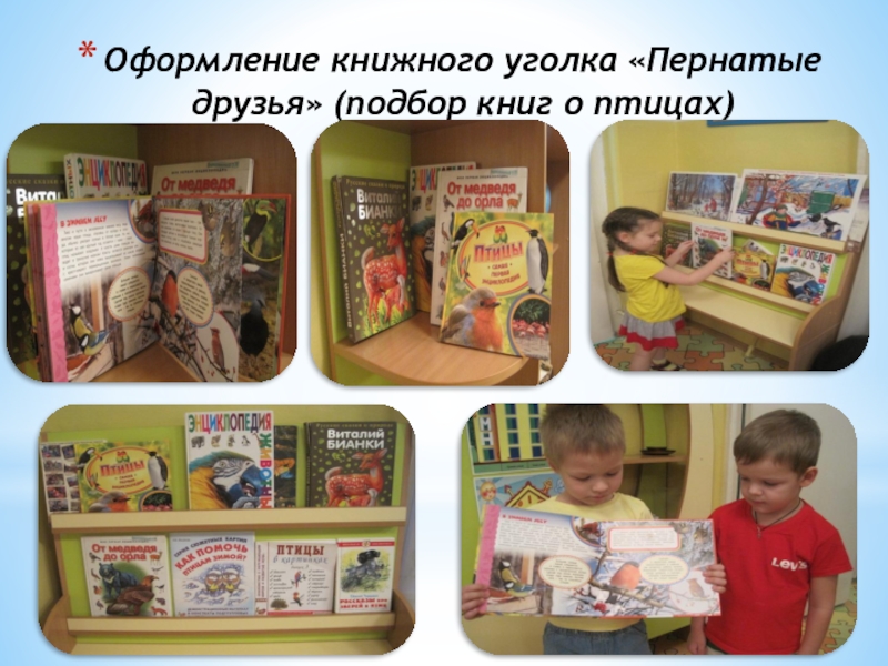 Оформление книжного уголка «Пернатые друзья» (подбор книг о птицах).