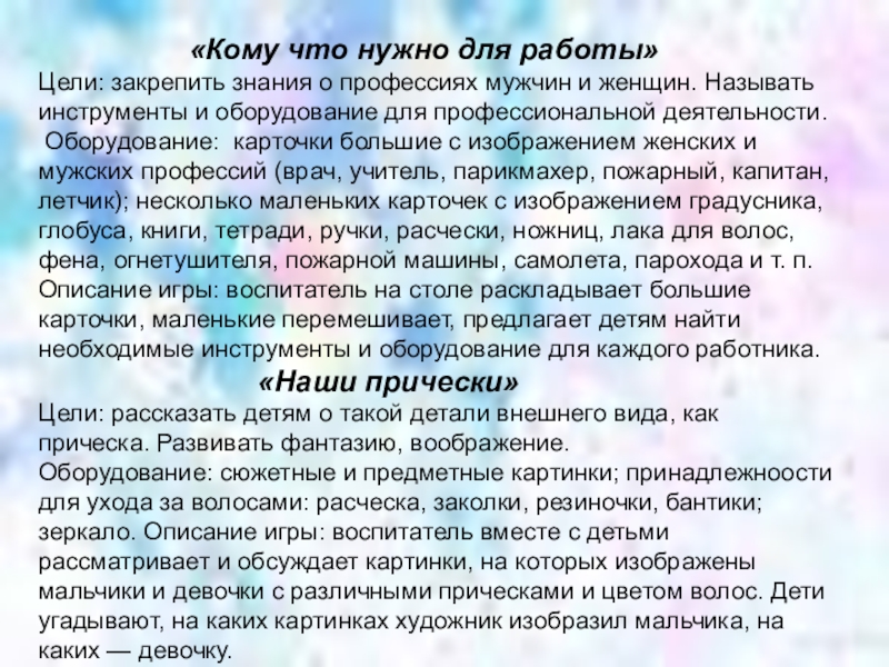 Оборудование: сюжетные и предметные картинки; принадлежноости для ухода за волосами: расческа, заколки, резиночки, бантики; зеркало. Описание игры: воспитатель вместе с детьми рассматривает и обсуждает картинки, на которых изображены мальчики и девочки с различными прическами и цветом волос. Дети угадывают, на каких картинках художник изобразил мальчика, на каких — девочку.