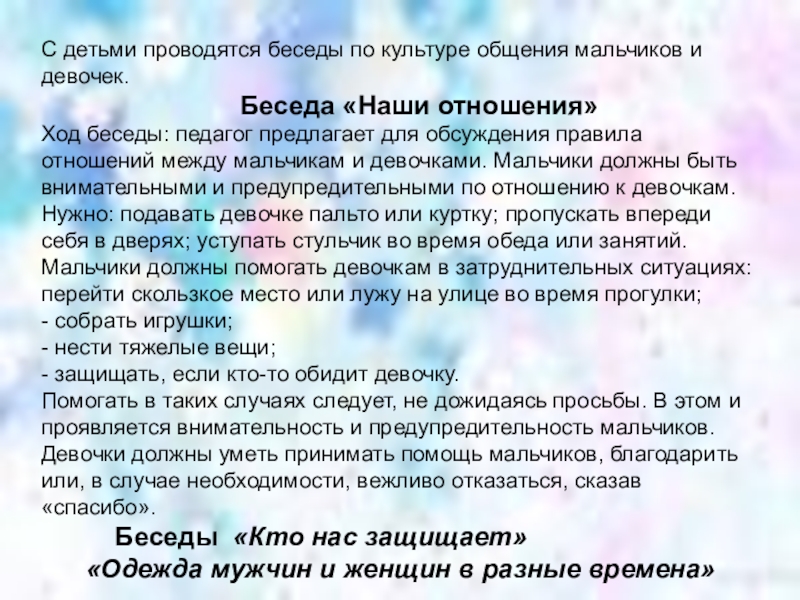 Ход беседы: педагог предлагает для обсуждения правила отношений между мальчикам и девочками. Мальчики должны быть внимательными и предупредительными по отношению к девочкам. Нужно: подавать девочке пальто или куртку; пропускать впереди себя в дверях; уступать стульчик во время обеда или занятий.