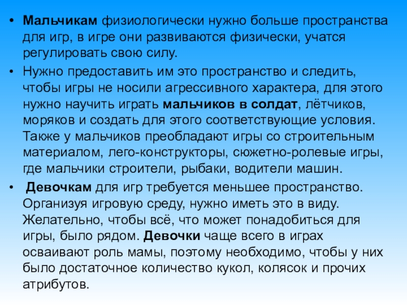 Слайд 9Мальчикам физиологически нужно больше пространства для игр, в игре они развиваются физически,