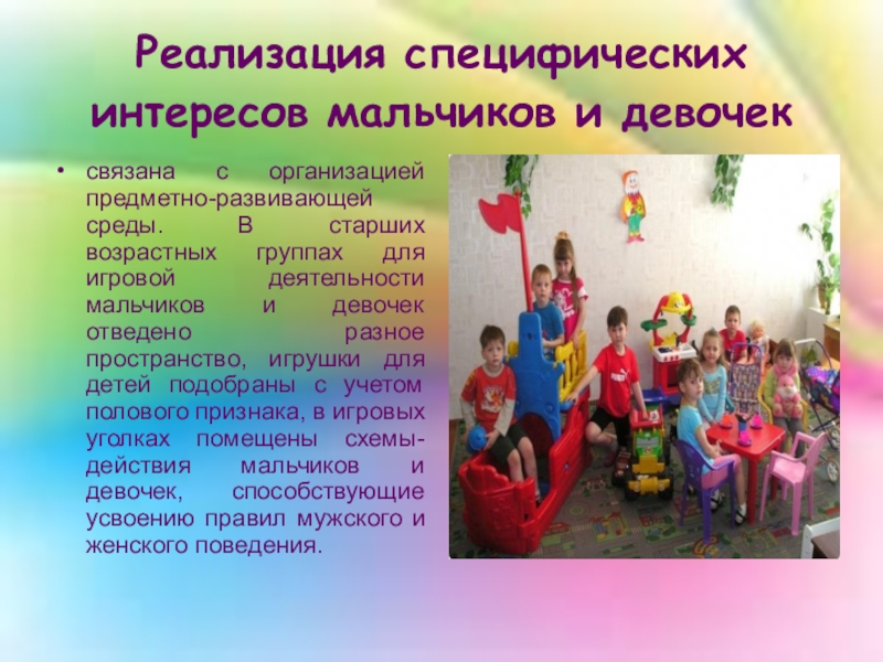 Слайд 13Реализация специфических интересов мальчиков и девочек