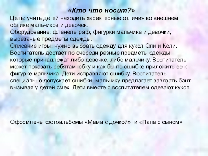 Описание игры: нужно выбрать одежду для кукол Оли и Коли. Воспитатель достает по очереди разные предметы одежды, которые принадлежат либо девочке, либо мальчику. Воспитатель может показать ребятам юбку и как бы по ошибке приложить ее к фигурке мальчика. Дети исправляют ошибку. Воспитатель специально допускает ошибки, мальчику предлагает завязать бант, вызывая у детей смех. Дети вместе с воспитателем одевают кукол.