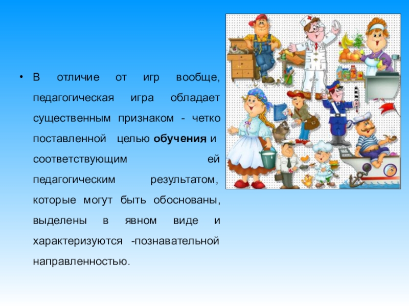 Слайд 4В отличие от игр вообще, педагогическая игра обладает существенным признаком -
