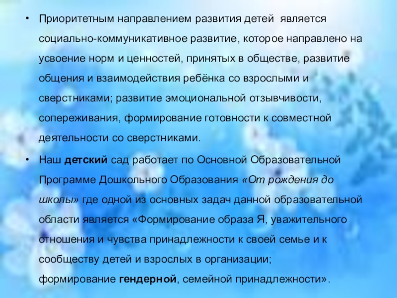 Слайд 5Приоритетным направлением развития детей является социально-коммуникативное развитие, которое направлено на усвоение