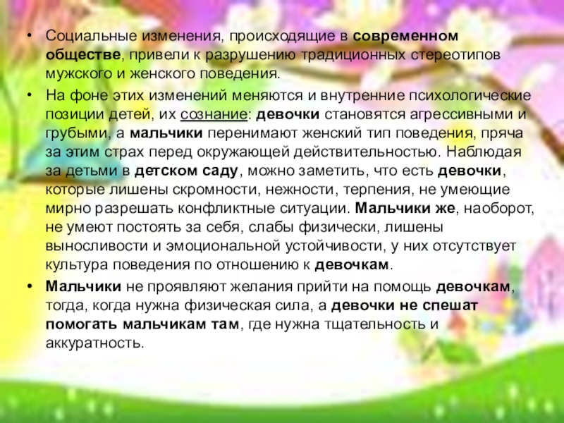 На фоне этих изменений меняются и внутренние психологические позиции детей, их сознание: девочки становятся агрессивными и грубыми, а мальчики перенимают женский тип поведения, пряча за этим страх перед окружающей действительностью. Наблюдая за детьми в детском саду, можно заметить, что есть девочки, которые лишены скромности, нежности, терпения, не умеющие мирно разрешать конфликтные ситуации. Мальчики же, наоборот, не умеют постоять за себя, слабы физически, лишены выносливости и эмоциональной устойчивости, у них отсутствует культура поведения по отношению к девочкам.