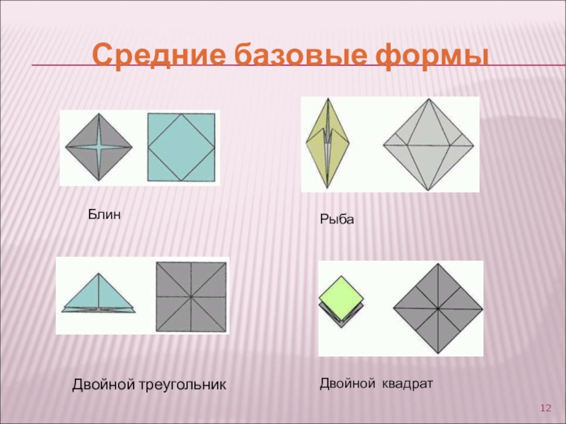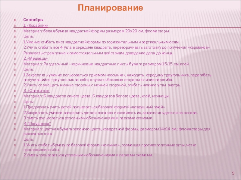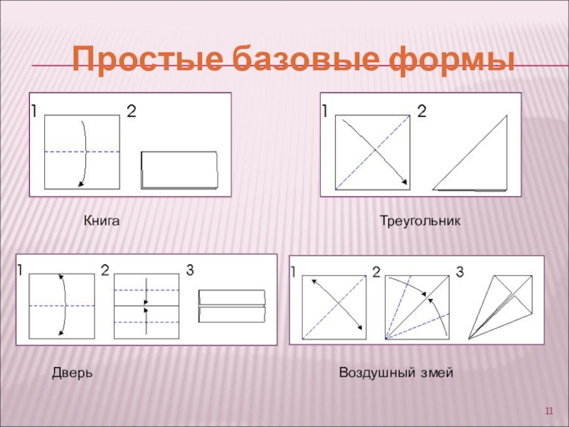1.Учить сгибать бумагу по базовой форме «косынка», совмещая противоположные углы, четко проглаживая сгибы.