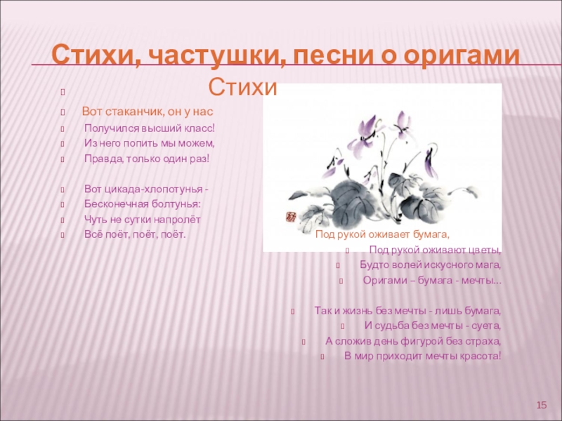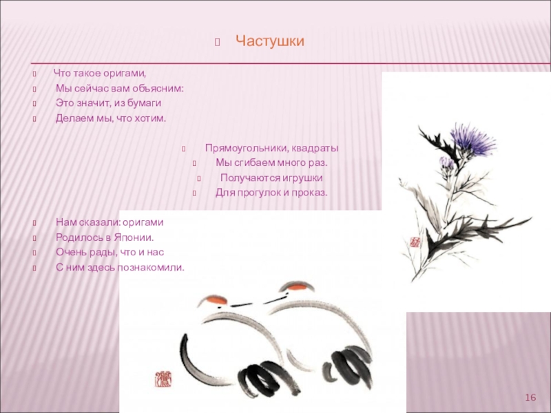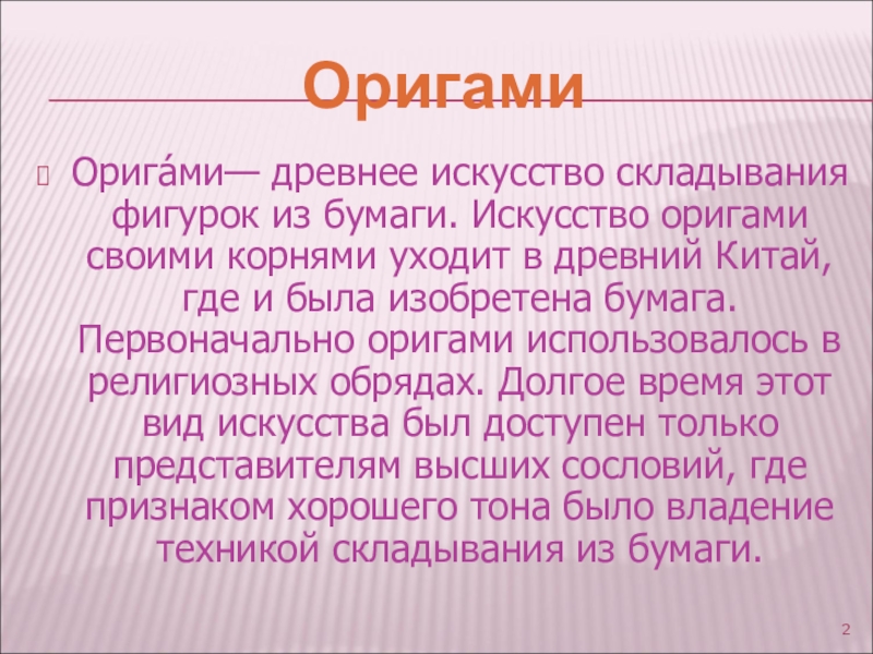 Орига́ми— древнее искусство складывания фигурок из бумаги. Искусство оригами своими корнями