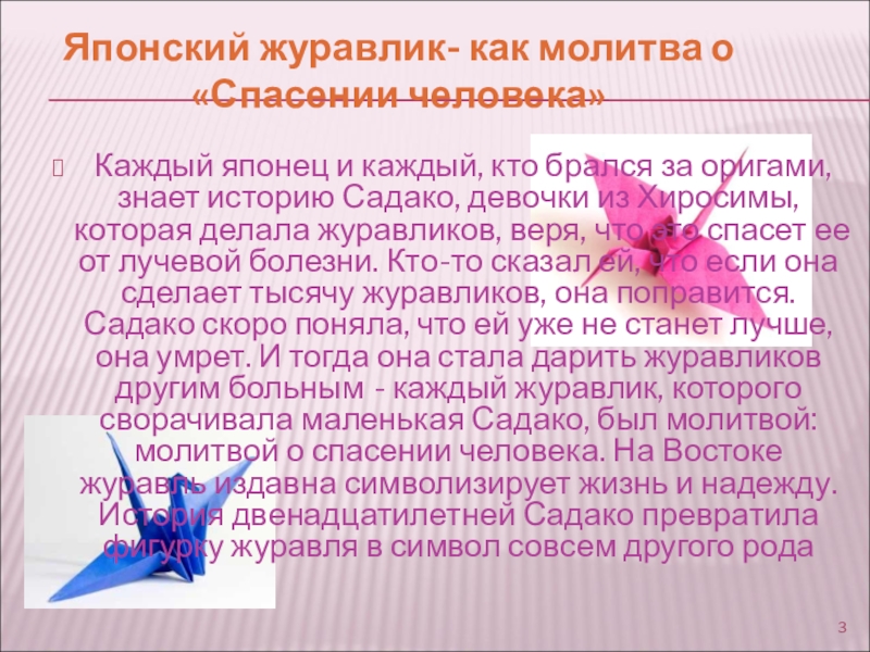 Слайд 3Японский журавлик- как молитва о «Спасении человека»