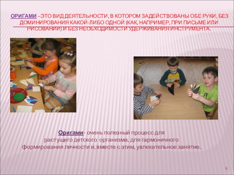 Слайд 6ОРИГАМИ –ЭТО ВИД ДЕЯТЕЛЬНОСТИ, В КОТОРОМ ЗАДЕЙСТВОВАНЫ ОБЕ РУКИ, БЕЗ ДОМИНИРОВАНИЯ