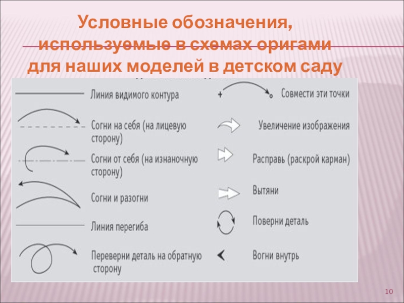 Слайд 10Условные обозначения, используемые в схемах оригами для наших моделей в детском