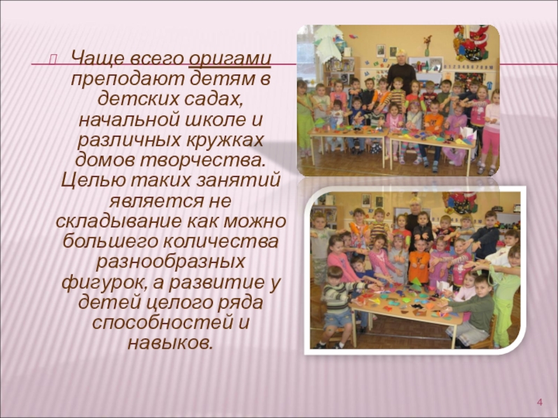 Слайд 4Чаще всего оригами преподают детям в детских садах, начальной школе и