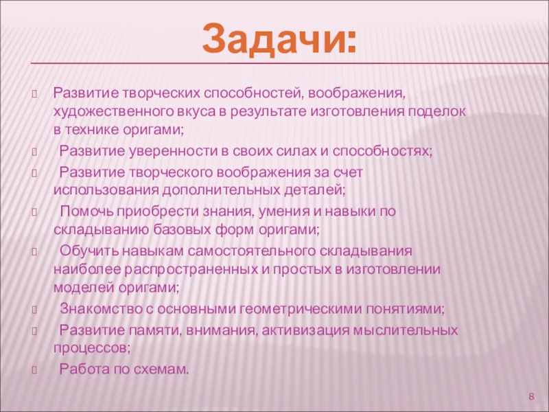 Обучить навыкам самостоятельного складывания наиболее распространенных и простых в изготовлении моделей оригами;