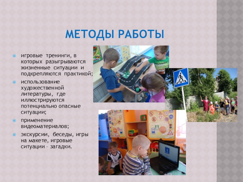 Методы работыигровые тренинги, в которых разыгрываются жизненные ситуации и подкрепляются практикой;использование художественной литературы, где иллюстрируются потенциально опасные