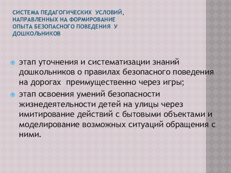 СИСТЕМА ПЕДАГОГИЧЕСКИХ УСЛОВИЙ, НАПРАВЛЕННЫХ НА ФОРМИРОВАНИЕ ОПЫТА БЕЗОПАСНОГО ПОВЕДЕНИЯ У ДОШКОЛЬНИКОВэтап уточнения и систематизации знаний дошкольников о