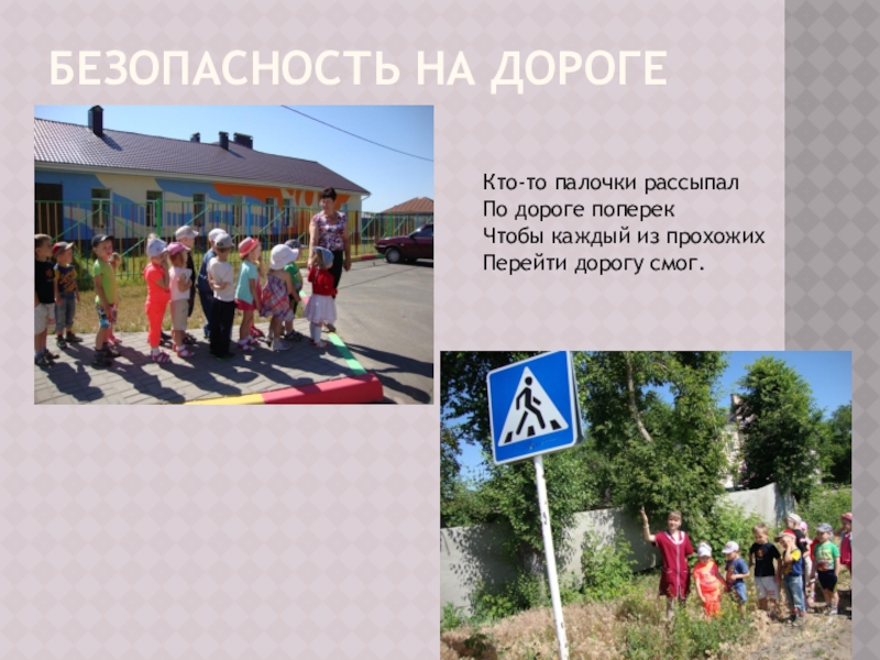 Безопасность на дорогеКто-то палочки рассыпал По дороге поперек Чтобы каждый из прохожих Перейти дорогу смог.
