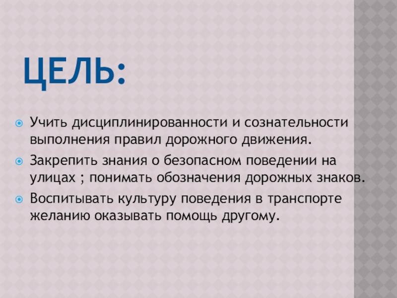 Цель:Учить дисциплинированности и сознательности выполнения правил дорожного движения.  Закрепить знания о безопасном поведении на улицах ;