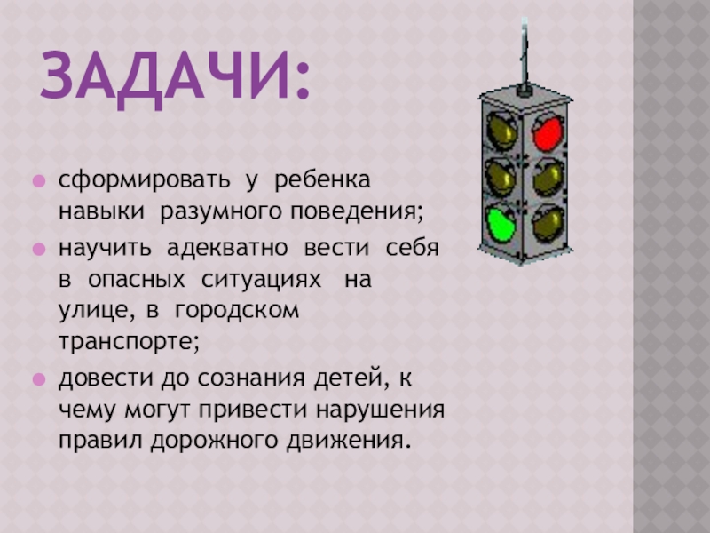Задачи:сформировать у ребенка навыки разумного поведения;научить адекватно вести себя в опасных ситуациях  на улице, в городском