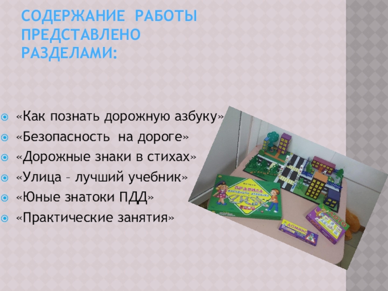 СОДЕРЖАНИЕ РАБОТЫ ПРЕДСТАВЛЕНО РАЗДЕЛАМИ:«Как познать дорожную азбуку»«Безопасность на дороге»«Дорожные знаки в стихах»«Улица – лучший учебник»«Юные знатоки ПДД»«Практические