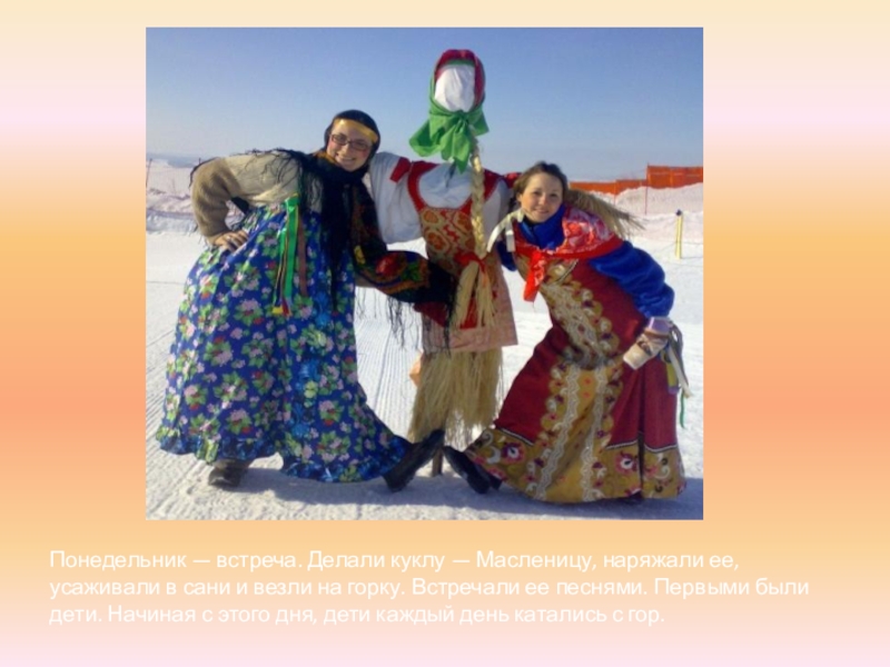 Слайд 8Понедельник — встреча. Делали куклу — Масленицу, наряжали ее, усаживали в