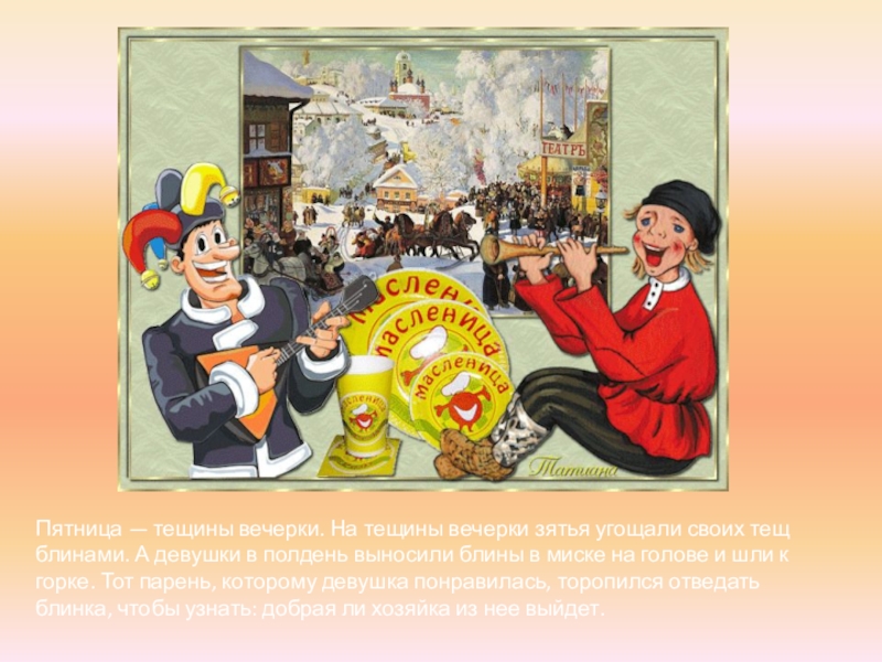 Слайд 12Пятница — тещины вечерки. На тещины вечерки зятья угощали своих тещ