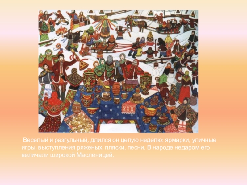 Слайд 3 Веселый и разгульный, длился он целую неделю: ярмарки, уличные игры, выступления