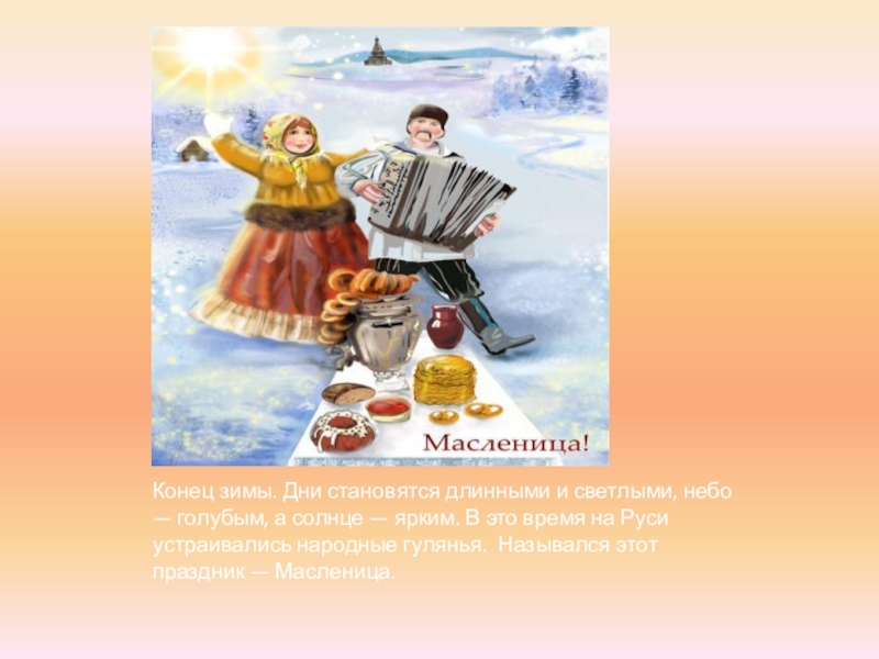 солнце — ярким. В это время на Руси устраивались народные гулянья. Назывался этот праздник — Масленица.