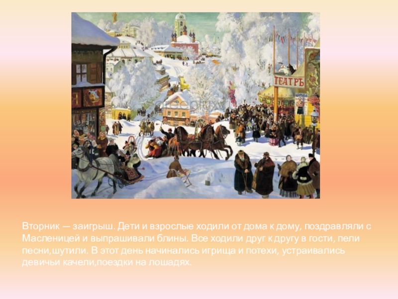 Слайд 9Вторник — заигрыш. Дети и взрослые ходили от дома к дому,