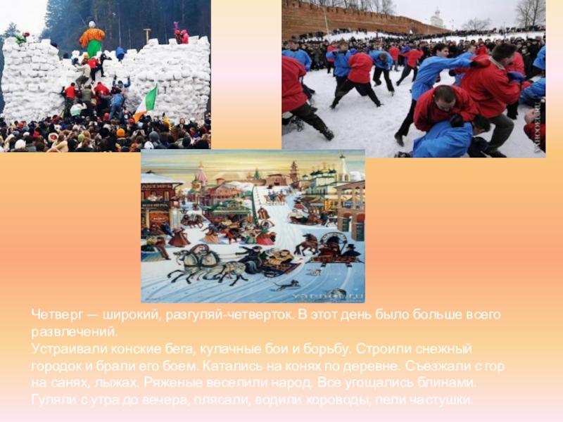 Слайд 11Четверг — широкий, разгуляй-четверток. В этот день было больше всего развлечений.
