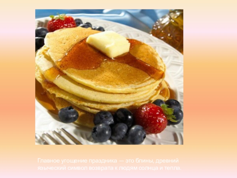 Слайд 4Главное угощение праздника — это блины, древний языческий символ возврата к