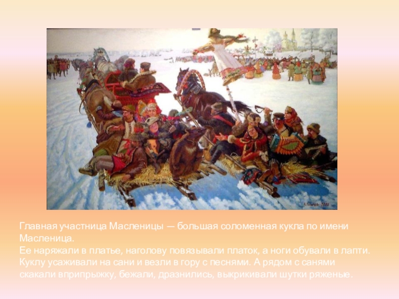 в платье, наголову повязывали платок, а ноги обували в лапти. Куклу усаживали на сани и везли в гору с песнями. А рядом с санями скакали вприпрыжку, бежали, дразнились, выкрикивали шутки ряженые.