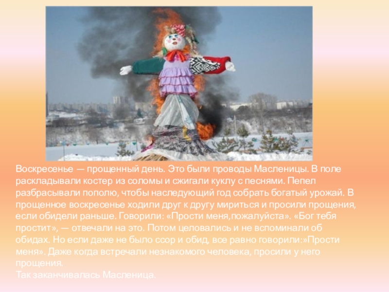 костер из соломы и сжигали куклу с песнями. Пепел разбрасывали пополю, чтобы наследующий год собрать богатый урожай. В прощенное воскресенье ходили друг к другу мириться и просили прощения, если обидели раньше. Говорили: «Прости меня,пожалуйста». «Бог тебя простит», — отвечали на это. Потом целовались и не вспоминали об обидах. Но если даже не было ссор и обид, все равно говорили:»Прости меня». Даже когда встречали незнакомого человека, просили у него прощения.