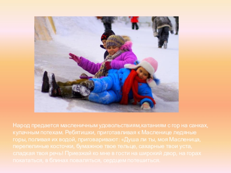 Слайд 5Народ предается масленичным удовольствиям,катаниям с гор на санках, кулачным потехам. Ребятишки,