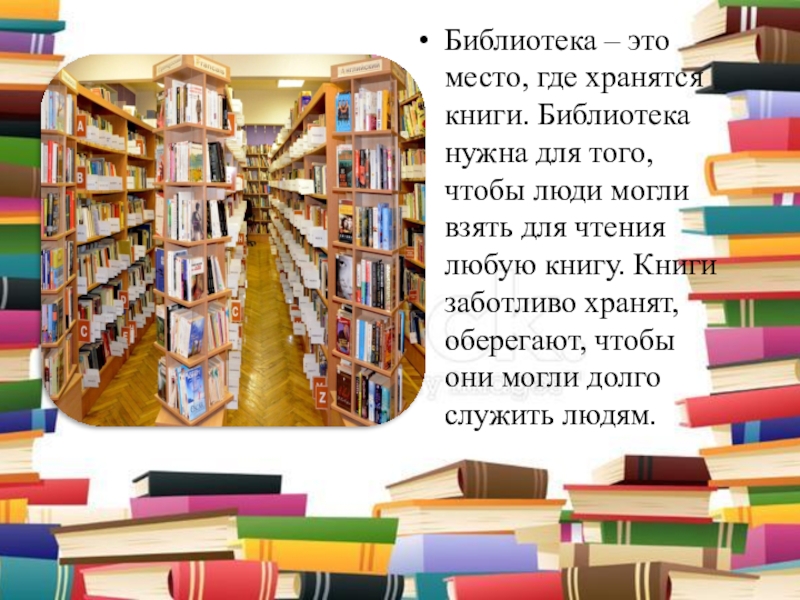 Слайд 2Библиотека – это место, где хранятся книги. Библиотека нужна для того,
