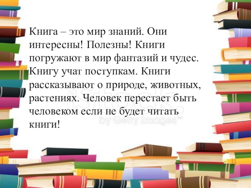 Слайд 3Книга – это мир знаний. Они интересны! Полезны! Книги погружают в