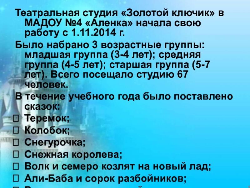 Слайд 30Театральная студия «Золотой ключик» в МАДОУ №4 «Аленка» начала свою работу