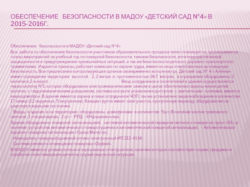 Слайд 15Обеспечение безопасности в МАДОУ «Детский сад №4» В 2015-2016Г.
