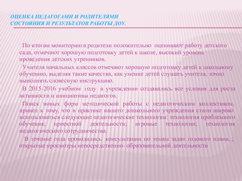 родители положительно оценивают работу детского сада, отмечают хорошую подготовку детей к школе, высокий уровень проведения детских утренников.