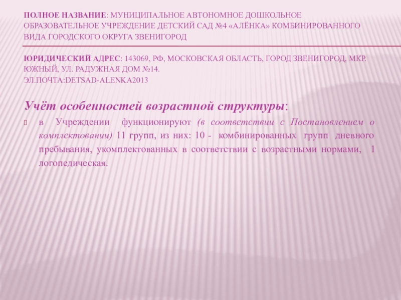 Слайд 3Полное название: Муниципальное автономное дошкольное образовательное учреждение детский сад №4 «Алёнка»