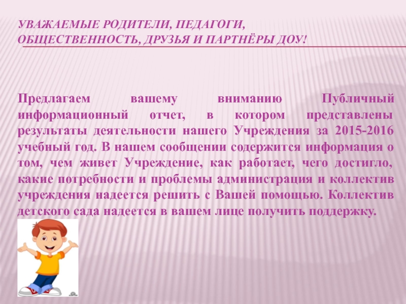 отчет, в котором представлены результаты деятельности нашего Учреждения за 2015-2016 учебный год. В нашем сообщении содержится информация о том, чем живет Учреждение, как работает, чего достигло, какие потребности и проблемы администрация и коллектив учреждения надеется решить с Вашей помощью. Коллектив детского сада надеется в вашем лице получить поддержку.