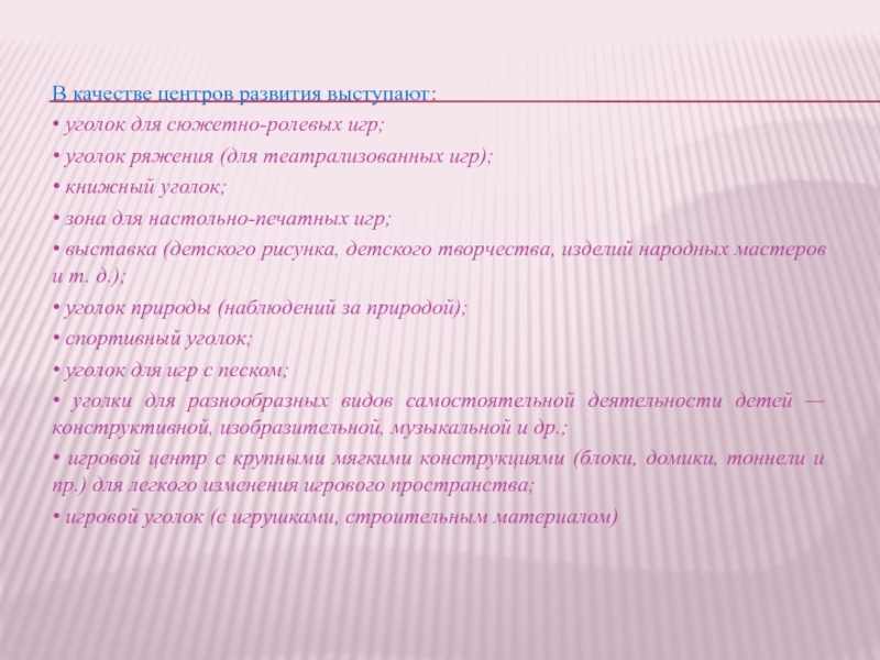 • уголки для разнообразных видов самостоятельной деятельности детей — конструктивной, изобразительной, музыкальной и др.;