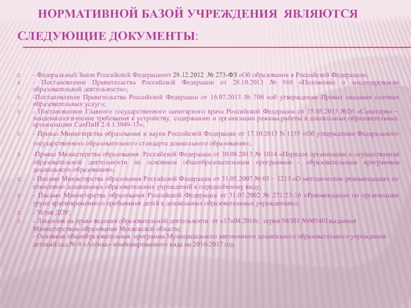 Слайд 4Нормативной базой Учреждения являются следующие документы: