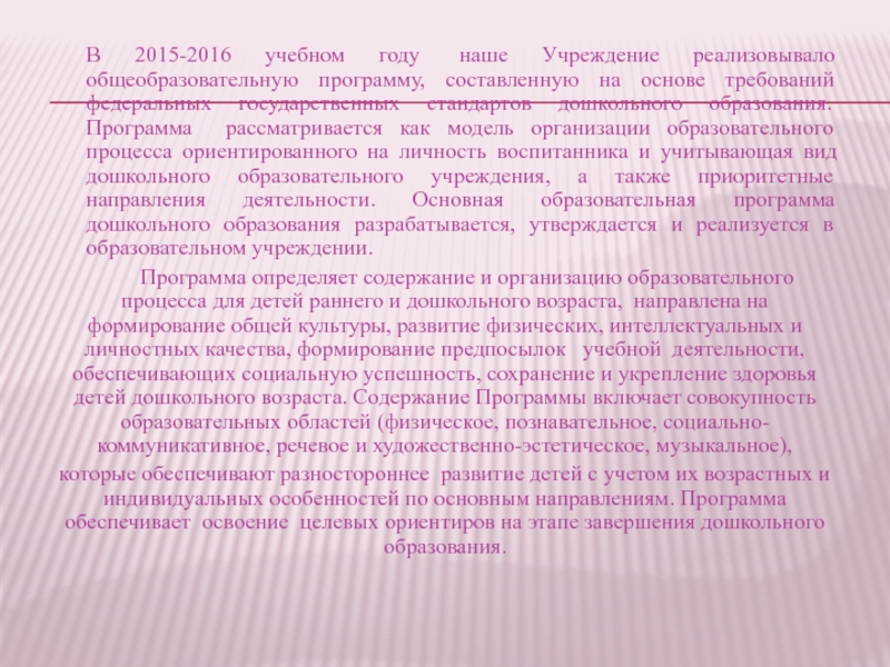 Слайд 7В 2015-2016 учебном году наше Учреждение реализовывало общеобразовательную программу, составленную на