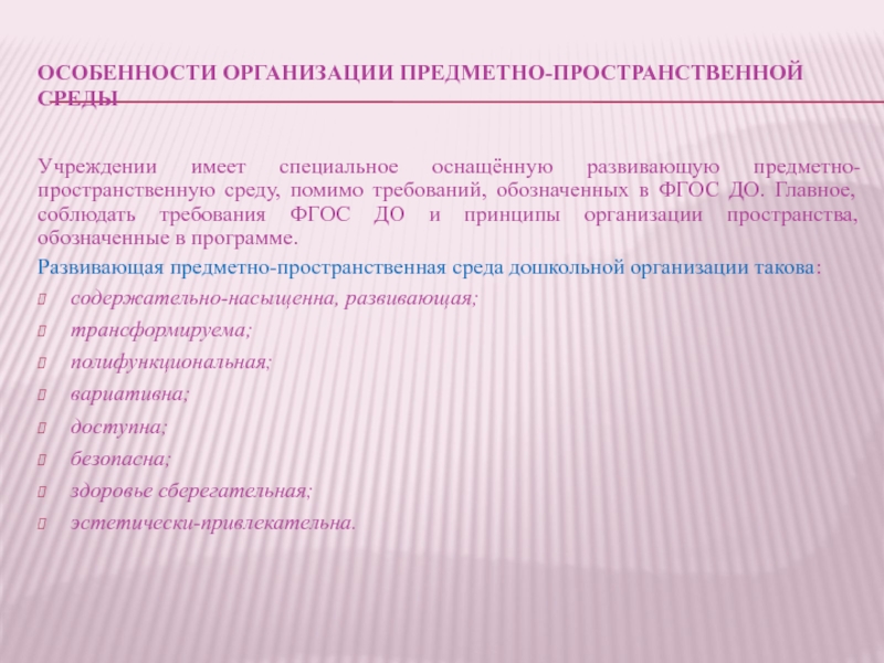 Слайд 20Особенности организации предметно-пространственной среды