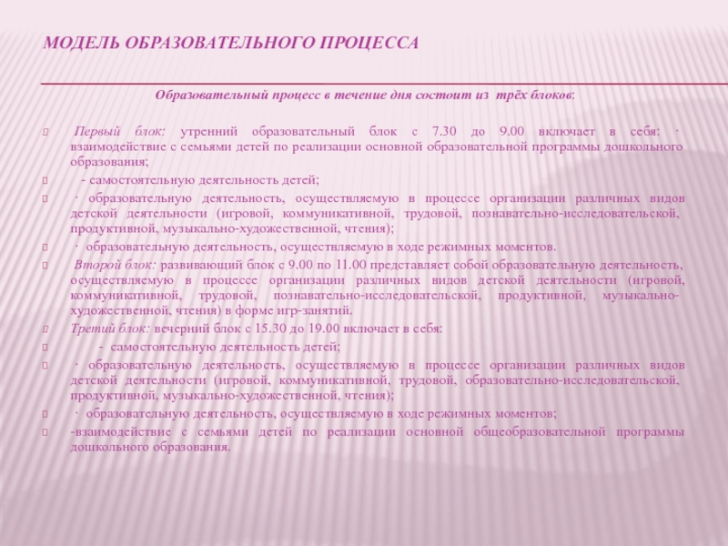 Первый блок: утренний образовательный блок с 7.30 до 9.00 включает в себя: · взаимодействие с семьями детей по реализации основной образовательной программы дошкольного образования;