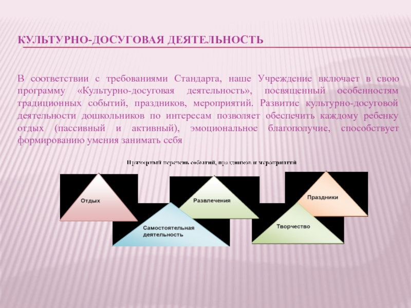 программу «Культурно-досуговая деятельность», посвященный особенностям традиционных событий, праздников, мероприятий. Развитие культурно-досуговой деятельности дошкольников по интересам позволяет обеспечить каждому ребенку отдых (пассивный и активный), эмоциональное благополучие, способствует формированию умения занимать себя